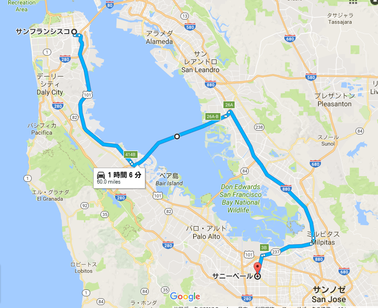 AT&Tボールパークの後はシリコンバレーと言われるサンノゼ・サニーベールに向かいます。ちょっと遠回りをして、こんな道順で行ってみました。