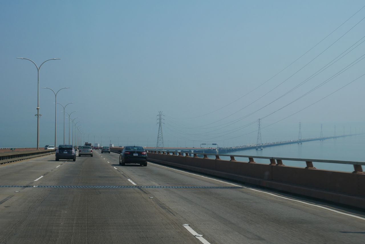 途中、海の上の橋を渡っています。東京のアクアラインに似たような道路ですが、規模が違います。まずこの橋は3車線でした。(アクアラインは2車線)