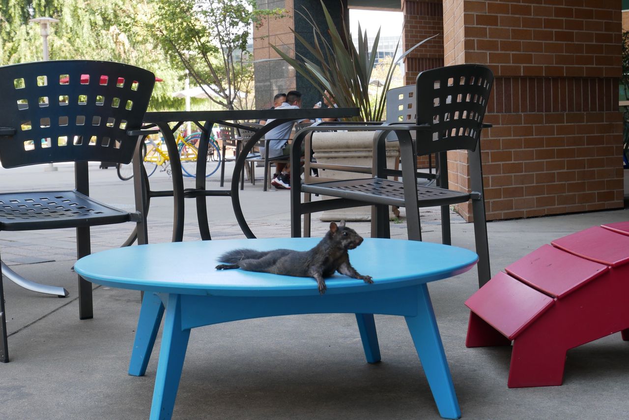 あと、リスみたいな動物もいました。机の上に寝ているのは、たぶんコンクリの上が暑すぎて、机の上で体を冷やしているんだと思います。