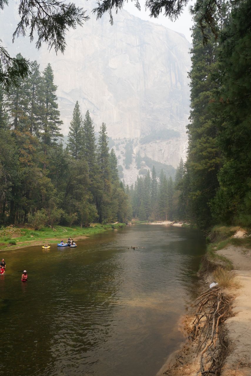 世界遺産で国立公園のヨセミテの川で水遊びする人たち。