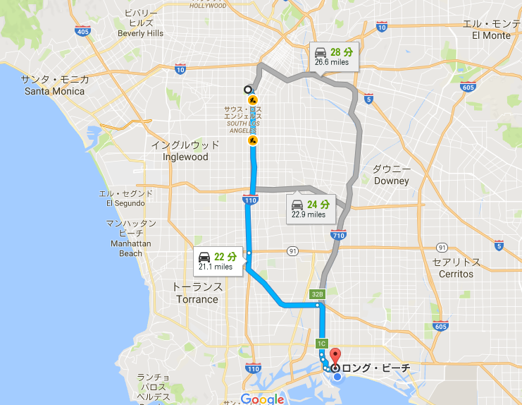今日のホテルはロサンゼルスのロングビーチ。ハリウッドは北で、ロングビーチは南。なので、20分くらいかけてロサンゼルスを縦断することになります。