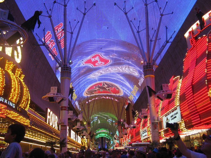 まずは車で10分くらいのラスベガスのダウンタウンへ。目的はフリーモントストリート。この施設は「総工費1700万USドルの目玉アトラクション。長さ450mのアーケードの屋根一面に、1250万個のLEDライトが組み込まれ、55万ワットの音響システムで流れるクイーンやドアーズの曲に合わせて、鮮明な映像が映し出される。(JTBサイト引用)」というところで、夜はこんな感じになっているそうです。
